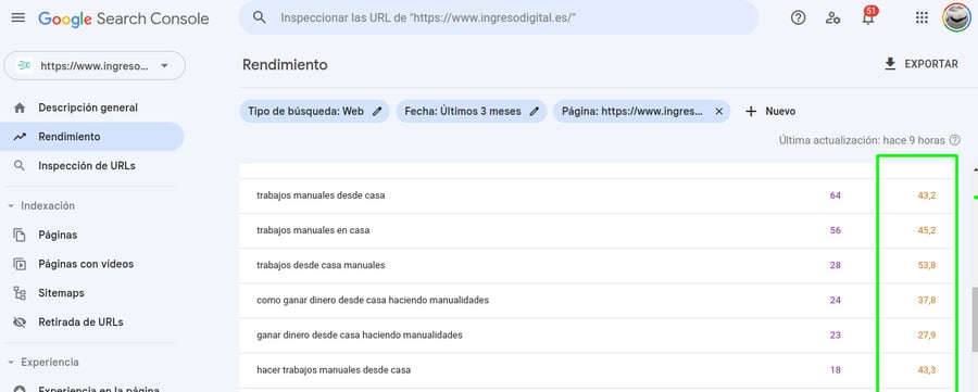 Podemos ver una url en Google Search Console para saber qué palabras clave ve relevantes para esa url y la posición media que ha tenido para así optimizarlas y tener un buen grifo abierto de visitas.
